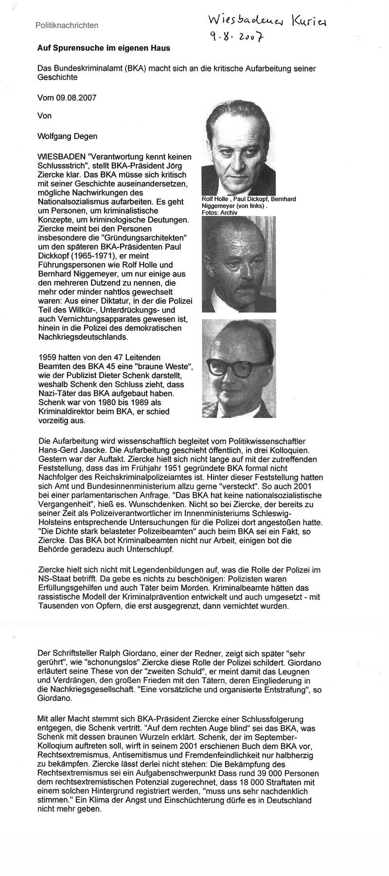 Das Buch „Die braunen Wurzeln des BKA“ und die grundsätzliche Haltung des BKA-Präsidenten Jörg Ziercke, dass sich das Amt seiner NS-Geschichte stellen soll, haben im Herbst 2007 zu drei BKA-Kolloquien geführt, zu denen auch ich eingeladen war. Mein Vortrag, meine Statements und meine Stellungnahme sind nachfolgend dokumentiert: