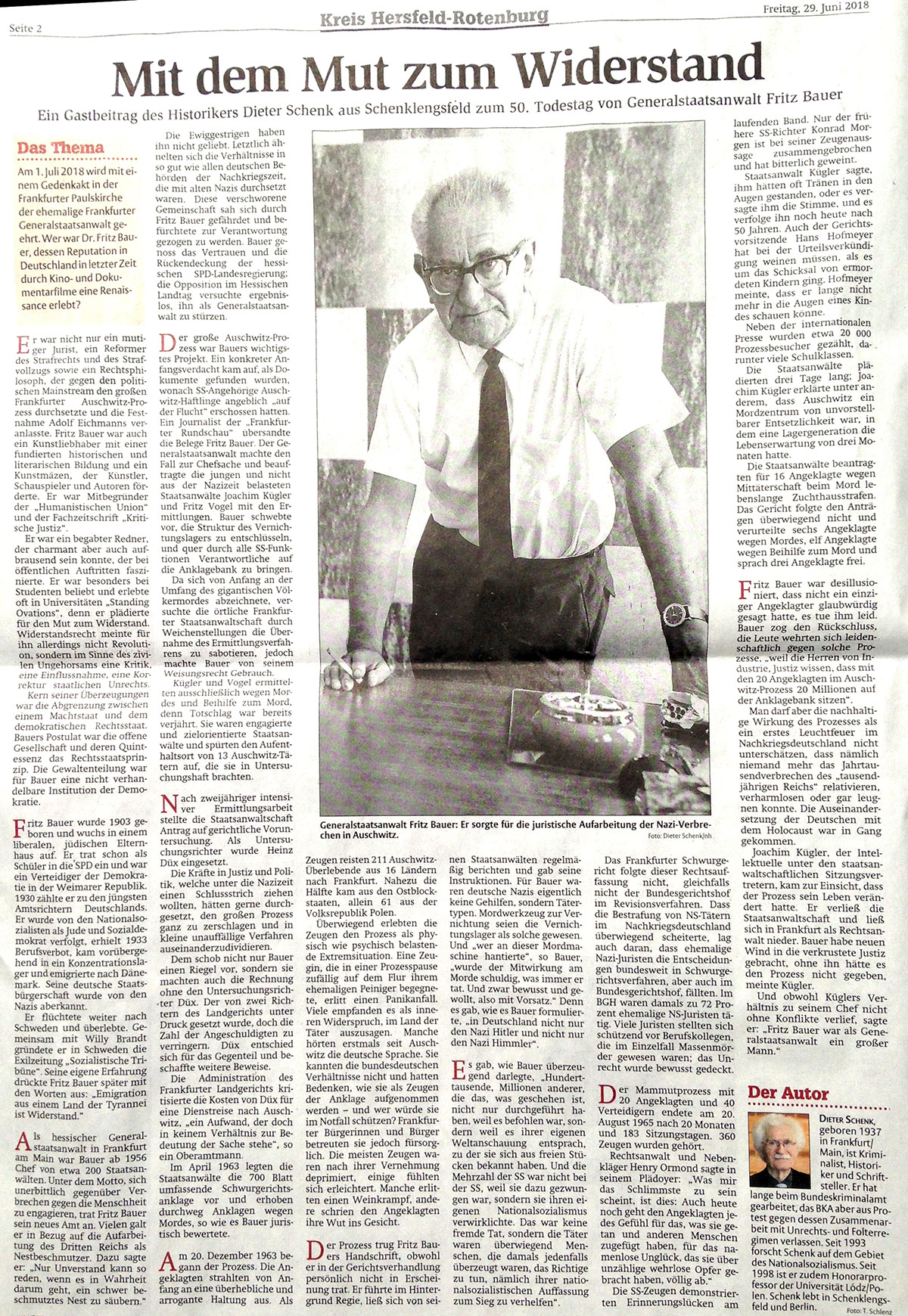 ZUM 50. TODESTAG VON GENERALSTAATSANWALT FRITZ BAUER Gastbeitrag Dieter Schenk Hersfelder Zeitung 29.6.2018