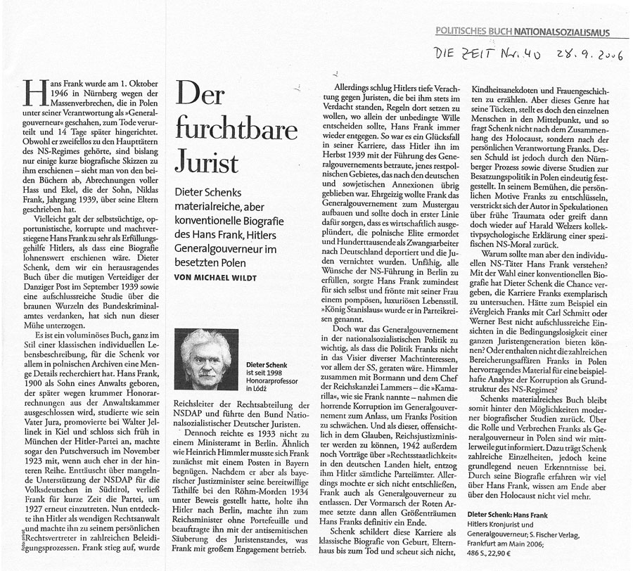 - Kunstliebhaber und Massenmörder. Die Karriere des Naziverbrechers Dr. Hans Frank