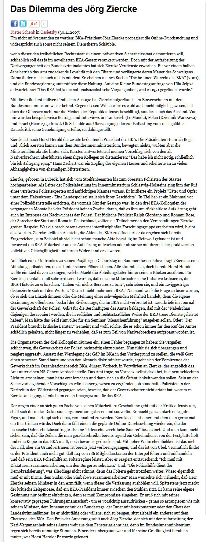 - Das Dilemma des Jörg Ziercke, Ossietzky 24/2007